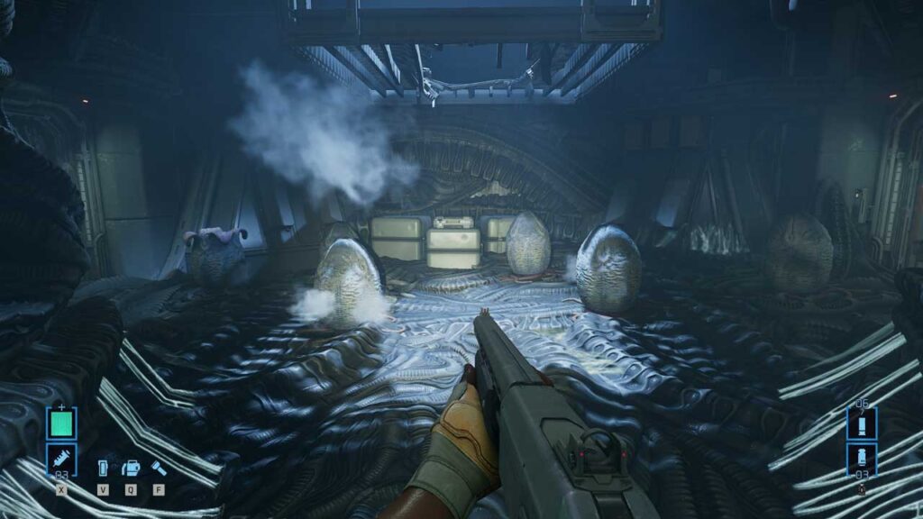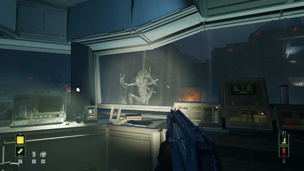 راهروهای کلاستروفوبیک به خوبی کار میکنند و دشمنان را مستقیماً به سمت شما هدایت میکنند، در حالی که شما دائماً در حالت آمادهباش هستید و منتظر حمله بعدی می مانید.در واقع از لحاظ گرافیک، همه چیز درست به نظر میرسد، از تفنگ پالس در دستتان گرفته تا زنومورفها وقتی از دریچهها میافتند یا در امتداد دیوارها میدوند. دوربین هم خیلی خوب کار میکند و حتی جزئیات کوچک هم دقیق هستند – برای مثال، لکه خونی که هنگام کشیده شدن یک قربانی بیخبر به داخل یک گاوصندوق به جا مانده، به فضاسازی بازی میافزاید.