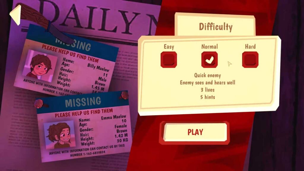 وقتی برای اولین بار وارد این بازی می شوید، با سه درجه سختی روبرو می شوید: Easy، Normal و Hard. حالت آسان تحت عنوان “Slow Enemy” توصیف شده است که در آن شخص آدم ربا که همان دشمن اصلی شماست، نمی تواند به درستی شما را ببیند و صدای قدم های شما را بشنود. این جمله یعنی اینکه در این حالت انتخابی که ساده ترین حالت قابل بازی محسوب می شود، هوش مصنوعی او در سطح پایینی قرار دارد و زیاد متوجه حضور شما نمی شود و به همین علت به راحتی می توانید مشغول انجام وظایف خود شوید، بدون اینکه اندکی احساس خطر کنید. این حالت برای بازیکنان بی تجربه سبک بقا بسیار مناسب است. همچنین در این حالت 5 آیتم زندگی دارید و برای 10 بار می توانید از سیستم راهنمایی بازی استفاده نمایید.