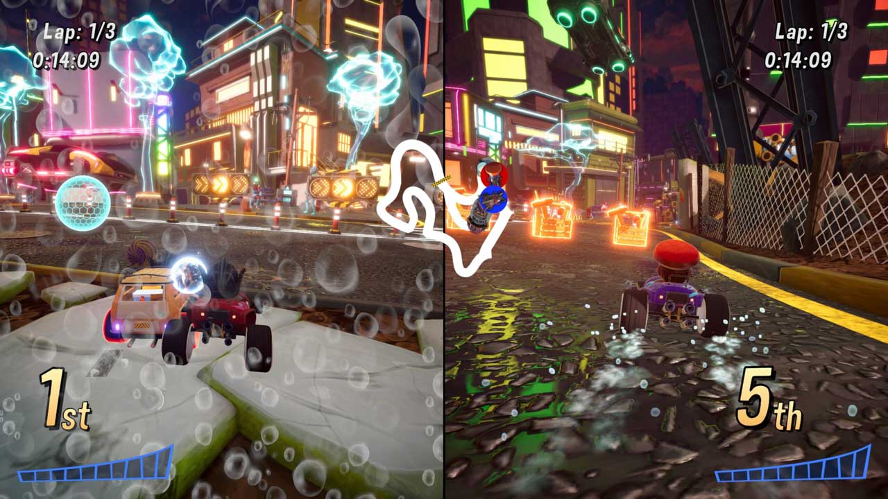 وقتی مقام اول را کسب می کنید، مسابقات قهرمانی جدیدی را برای بازی باز میکنید و وسایل نقلیه، مسیرها و لوازم تزئینی جدید برای شخصیتها به دست میآورید. این یک ایده عالی است که چیزی برای تلاش واقعی داشته باشید، با این حال، حیف است که حالتهای بیشتری در دسترس نیست، زیرا محتوا در حال حاضر بسیار محدود است. یک حالت نبرد در اینجا میتوانست تنوع خوبی ایجاد کند….