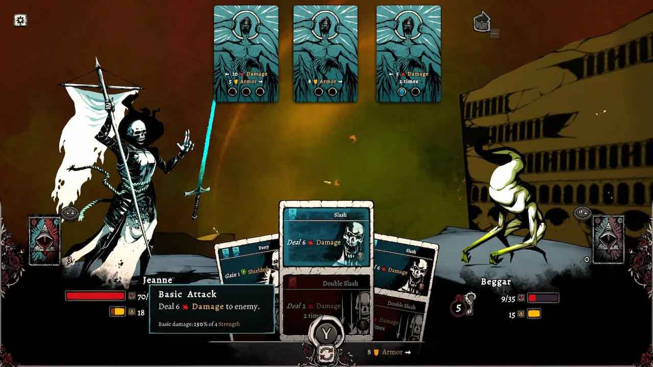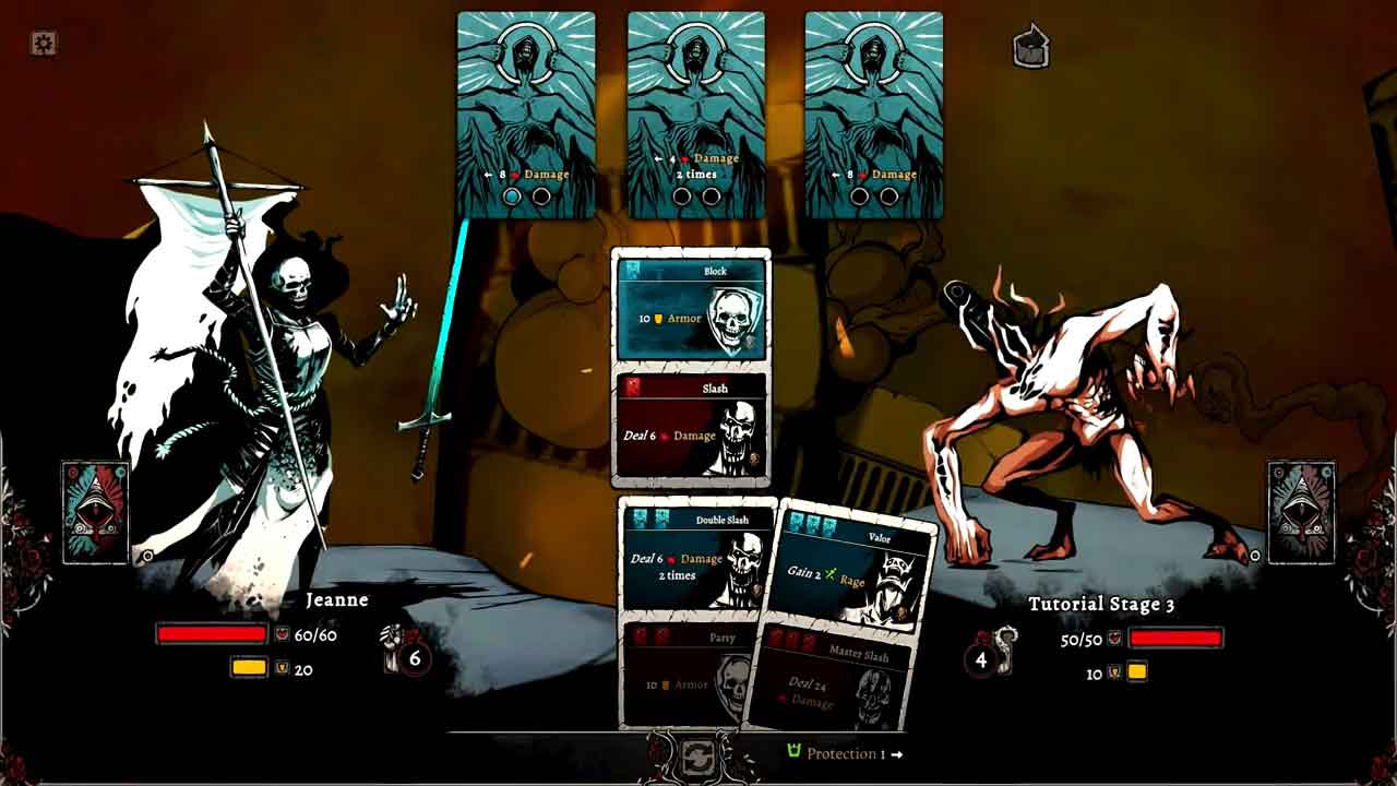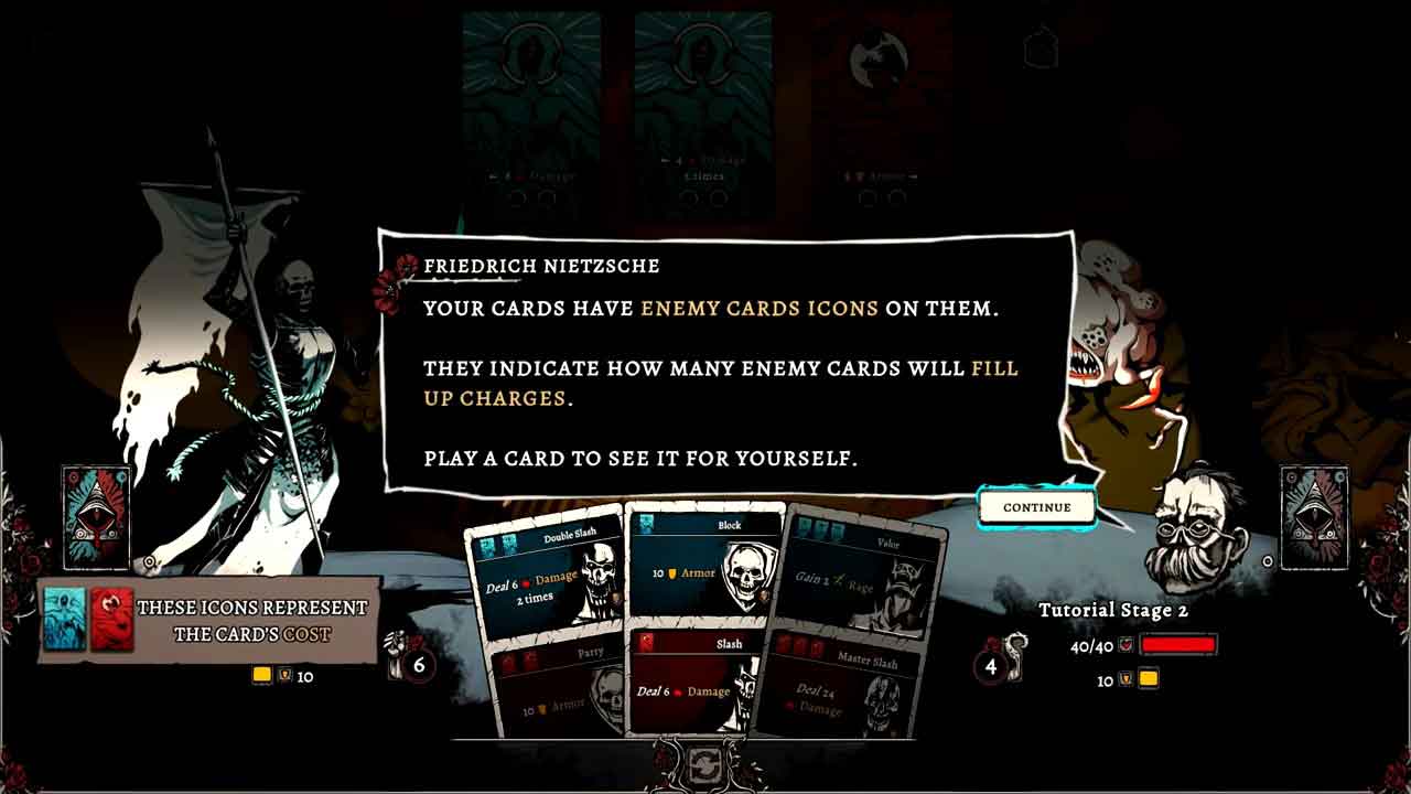 Nadir: A Grimdark Deck Builder وقت خود را تلف نمی کند و سریعا شما را وارد معرکه می کند. این بخش آموزش به شخصیتی به نام ژان دارک می‌گوید که با سه موجود نامقدس می‌جنگد و از نبرد مبتنی بر کارت استفاده می‌کند تا راه خود را عمیق‌تر به شهر جهنمی نادیر برساند. مکانیک های گیم پلی توسط شخصی به نام فردریش نیچه توضیح داده می شود که شما را با کلیات آشنا می کند. این آموزش به خوبی اصول اولیه بازی را توضیح می‌دهد، پس از یادگیری شما کارت‌هایی را بر می دارید که قدرت آبی و قرمز دارند. اینکه کدام قدرت را می توانید بازی کنید بستگی به تعداد کارت های قرمز یا آبی دارد که دشمن کشیده است.