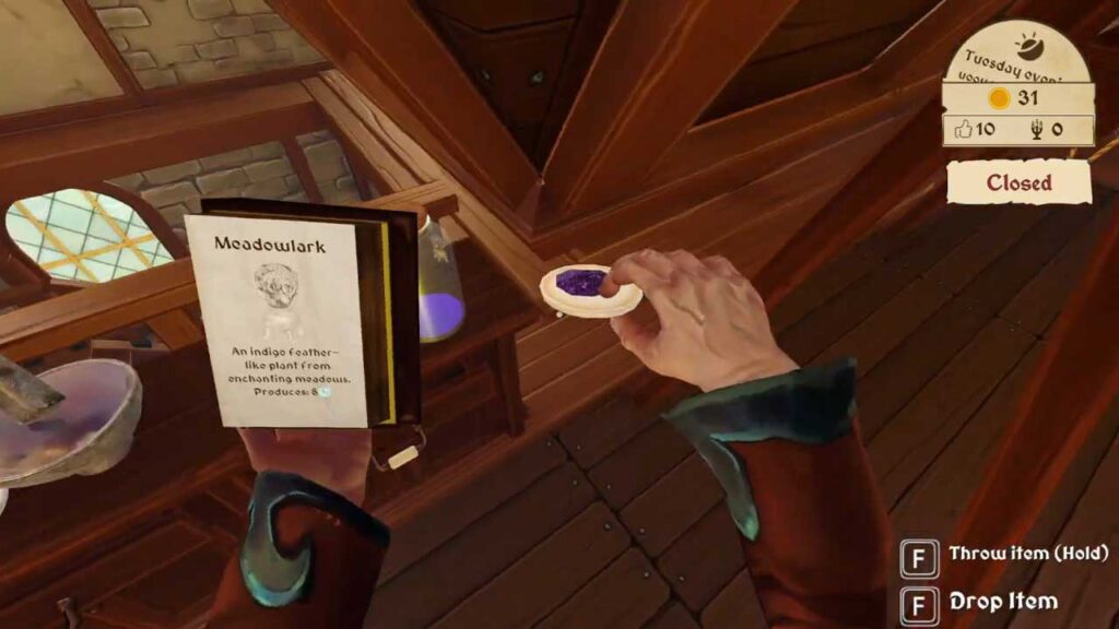 گیم پلی Potion Shop Simulator از المان های سایر عناوین شبیه سازی پیروی می کند که در آن، یک سری کارها را به شما آموزش می دهد و بایستی برای کسب درآمد و ارتقا مغازه خودتان، آنها را انجام دهید. برای درست کردن معجون ابتدا باید مواد اولیه لازم را تهیه کرد که در مجموع هشت به اصطلاح “واکنش دهنده ها” وجود دارد که می توان آنها را در سراسر شهر برداشت کرد. این مواد به صورت روزانه تولید می شوند و رکن اصلی کسب و کار معجون سازی ما خواهند بود. برای دم کردن یک معجون، به سادگی مواد را به دیگ خود اضافه کنید، هم بزنید، چند طلسم جادویی بگویید، و سپس یک معجون دم کرده را تحویل بگیرید. با این حال، انجام این کار به این سادگی ها هم که فکر می کنید، نیست.