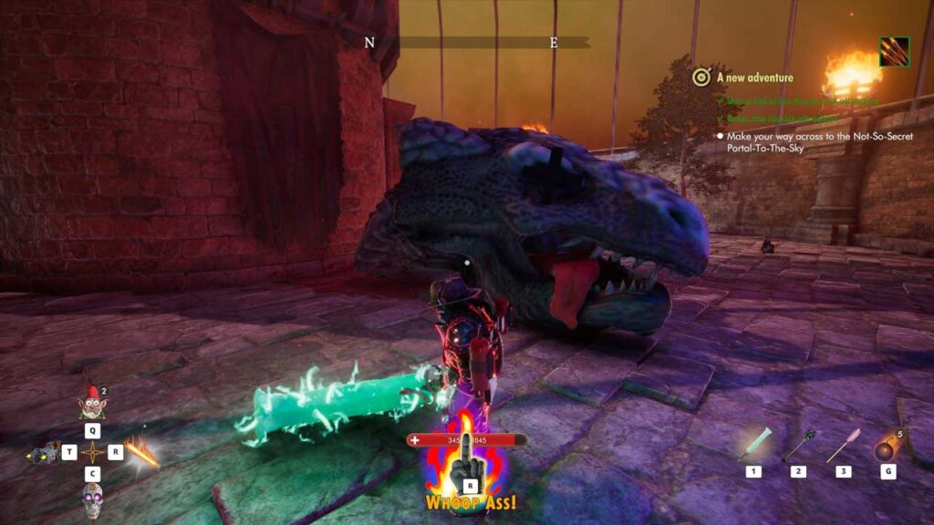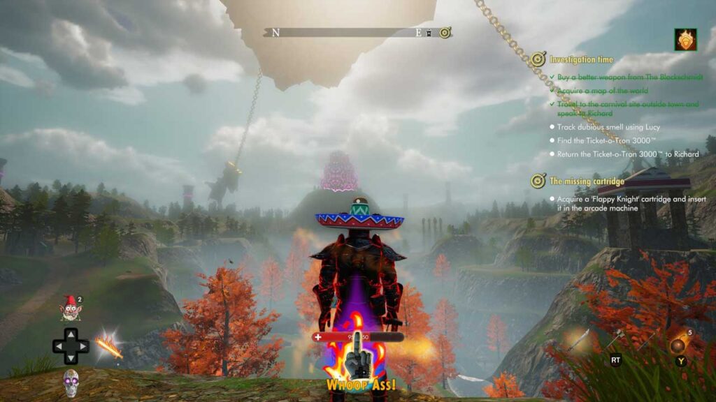 از همان صحنه اول، متوجه میشوید که بازی Sir Whoopass چقدر طنزآمیز و کنایه دار ارائه شده است. در حالی که اسکلتها، اورکها و هر چیزی بین آنها را نابود میکنید، این کار را با یک کلاه مسخره انجام میدهید که امتیازهای خاصی مانند ۲۵٪ آسیب بیشتر یا سرعت حرکت/چرخش سریعتر را به شما میدهد. با هر سطح بالاتر، میتوانید خودتان را نیز تقویت کنید و به او اجازه دهید قویتر، سریعتر، مقاومتر در برابر آسیب یا در غارت بهتر باشد.