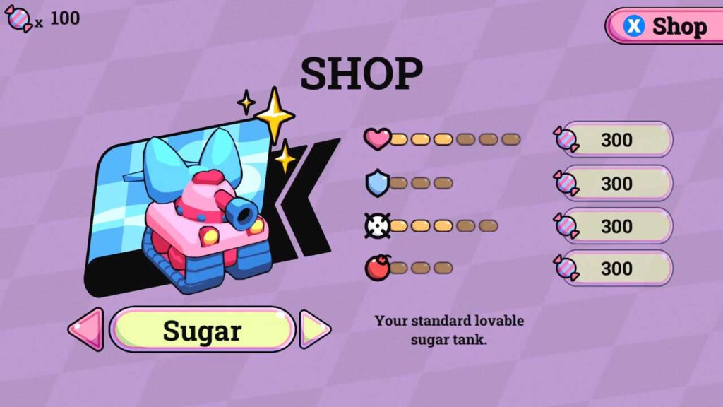 در مجموع بازی Sugar Tanks گیم پلی بسیار ساده و در عین حال جذابی دارد که حداقل ارزش یکبار تجربه را دارد. ارز رایج درون بازی آبنبات هایی هستند که از کشتن دشمنان به دست می آورید و تعداد آنها در قسمت بالای سمت چپ تصویر نمایش داده می شود.