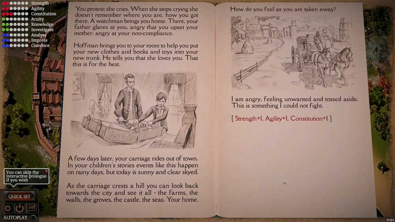 سالهای اولیه شخصیت شما با برخی از رویدادهای کلیدی که از قبل تعیین شدهاند، ادامه مییابد، اما در طول بازی به شما انتخابهای معناداری داده میشود. تقریباً مانند یک رمان ماجراجویی که خودتان انتخاب میکنید، اما تاریکتر و غوطهورتر. این تصمیمات اولیه نه تنها بر داستان تأثیر میگذارند؛ بلکه مستقیماً بر آمار شخصیت شما نیز اثرگذار است. این یک روش هوشمندانه و خلاقانه برای ساختن شخصیت شما از طریق روایت به جای منوها است و به انتخابهایی که میکنید معنای واقعی میبخشد.