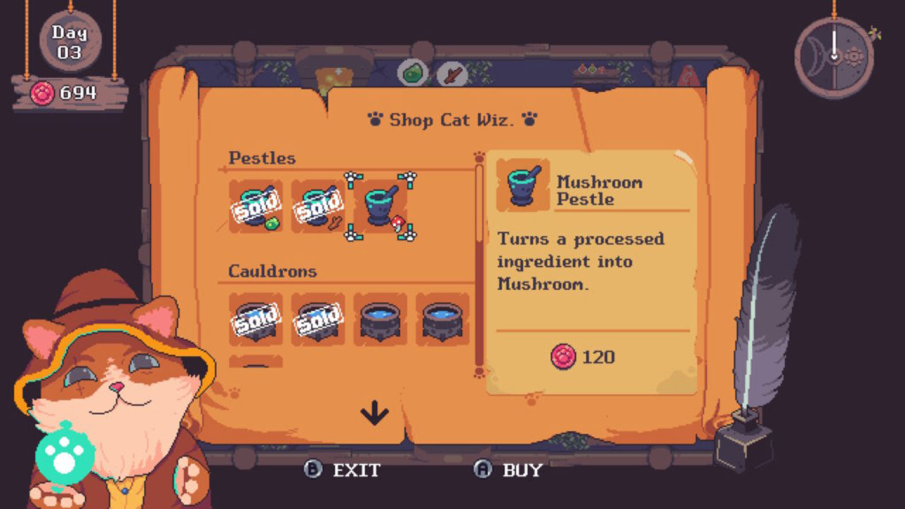 یک فروشگاه گوی کریستالی در بازی وجود دارد که به شما اجازه می‌دهد برخی از این مشکلات را جبران کنید و همچنین تجهیزات جدیدی برای فروشگاه مینیون‌ها بخرید. این تجهیزات اغلب برای دستور پخت‌ها مورد نیاز هستند، بنابراین نمی‌توان از خرید آنها اجتناب کرد. می‌توان آنها را بعداً فروخت، اما اگر اتفاقی یکی از آنها را که برای آن دور نیاز دارید بفروشید، با مشکل روبرو خواهید شد. زمان این فروشگاه به روز و شب تقسیم می‌شود و شب اغلب نسخه‌ی سخت‌تری از روز است، معمولاً با نوعی اختلال همراه است؛ مانند قارچ‌ها یا گودال‌های لجن. من واقعاً فقط تا منطقه‌ی دوم و روز هشتم بازی کردم و احساس کردم حلقه‌ی اصلی بازی انگار چیزی کم دارد که آن را واقعاً خاص می‌کند.